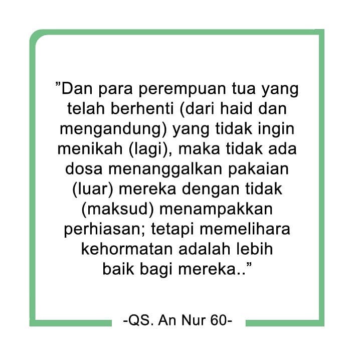 “Hai Nabi, katakanlah kepada isteri-isterimu, anak-anak perempuanmu dan isteri-isteri orang mukmin: “Hendaklah mereka mengulurkan jilbabnya ke seluruh tubuh mereka”. Yang demikian itu supaya mereka lebih mudah untuk dikenal, karena itu mereka tidak di ganggu. Dan Allah adalah Maha Pengampun lagi Maha Penyayang.” (QS. Al-Ahzab: 59)