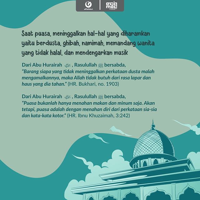 “Puasa bukanlah hanya menahan makan dan minum saja. Akan tetapi, puasa adalah dengan menahan diri dari perkataan sia-sia dan kata-kata kotor.” (HR. Ibnu Khuzaimah, 3:242. Al-A’zhomi mengatakan bahwa sanad hadits tersebut shahih).