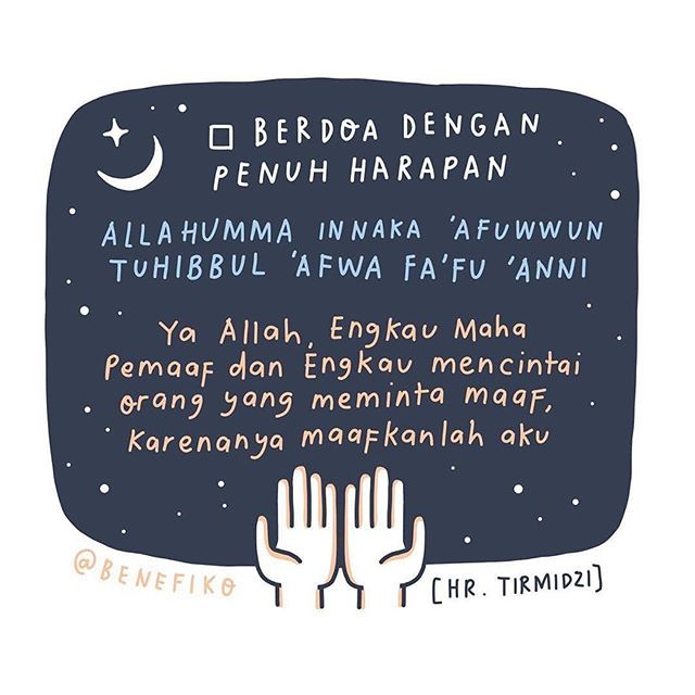 [7] Disunnahkan untuk memperbanyak do’a pada malam tersebut. Telah diriwayatkan dari Sayyidah Aisyah Radhiyallahu ‘anha, (dia) berkata : “Aku bertanya, “Ya Rasulullah ! Apa pendapatmu jika aku tahu kapan malam Lailatul Qadar (terjadi), apa yang harus aku ucapkan ?” Beliau menjawab, “Ucapkanlah : اللَّهُمَّ إِنَّكَ عَفُوٌّ تُحِبُّ الْعَفْوَ فَاعْفُ عَنِّي “Ya Allah Engkau Maha Pengampun dan mencintai orang yang meminta ampunan, maka ampunilah aku”